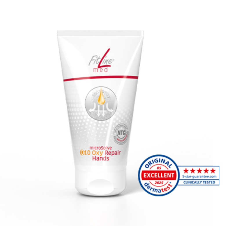 FitLine Med MicroSolve Q10 Oxy Repair Hands roku krēms ar koenzīmu Q10. Perfekta kopšana jūtīgai un kairinātai ādai ar tendenci uz sausumu. Novatoriskā microSolve® Q10 un molekulārā skābekļa kombinācija palīdz atbalstīt ādas atjaunošanos, tās nomierināšanu, kā arī samazina apsārtumu un niezi. Izbaudi bagātīgo kopšanu! Ātri iesūcas un nerada taukainu sajūtu. MicroSolve Q10 veicina pašas ādas bioloģisko šūnu procesus un piegādā ādai jaunu atjaunojošo enerģiju, molekulārais skābeklis atbalsta pašas ādas aizsargfunkciju.