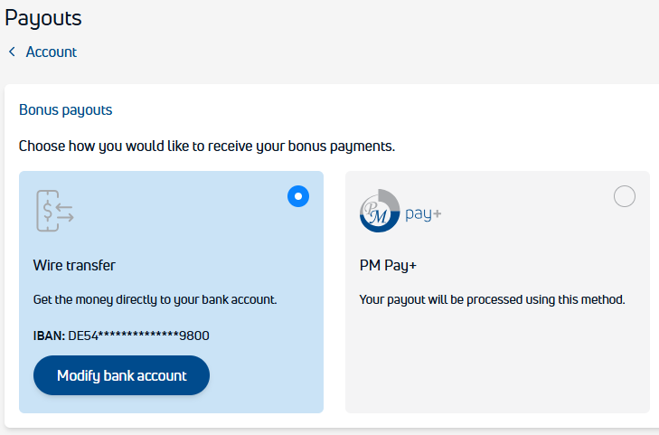 Paši bonusi tiek izmaksāti attiecīgi 15. datumā uz partnera norādīto IBAN konta numuru vai PM Pay+ elektronisko maciņu. To var izdarīt PM Office sadaļā Account apakšsadaļā Payouts iedalījumā Bonus payouts.